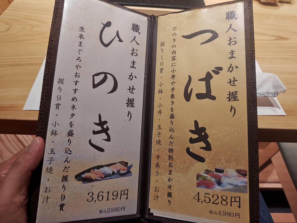 - ひのきコース(税込3,980円):握り9貫・小鉢・玉子焼・お汁