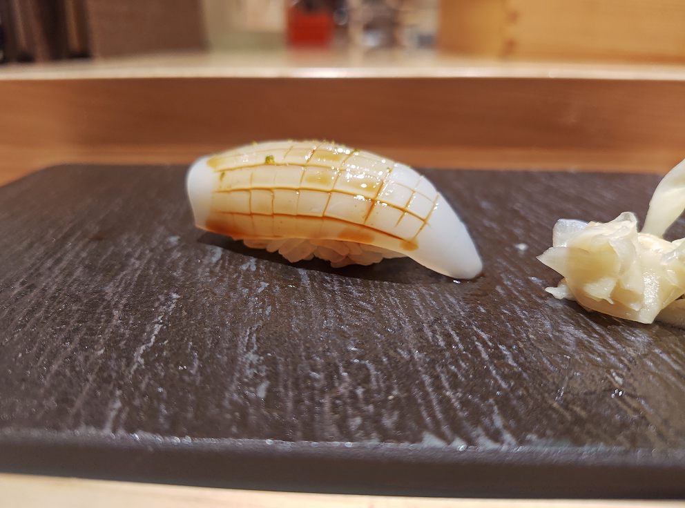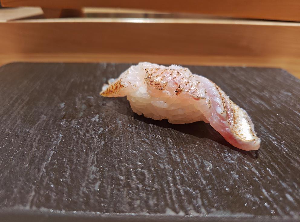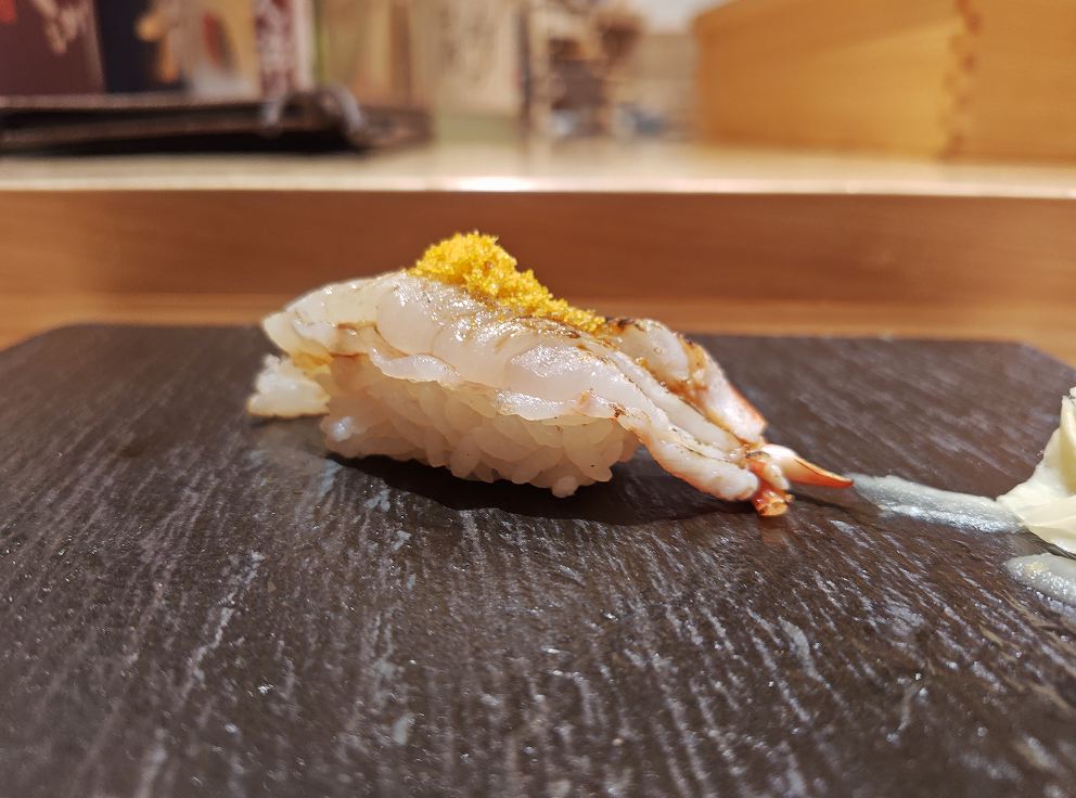 次は「天然甘エビの炙り・唐墨の削り」です。