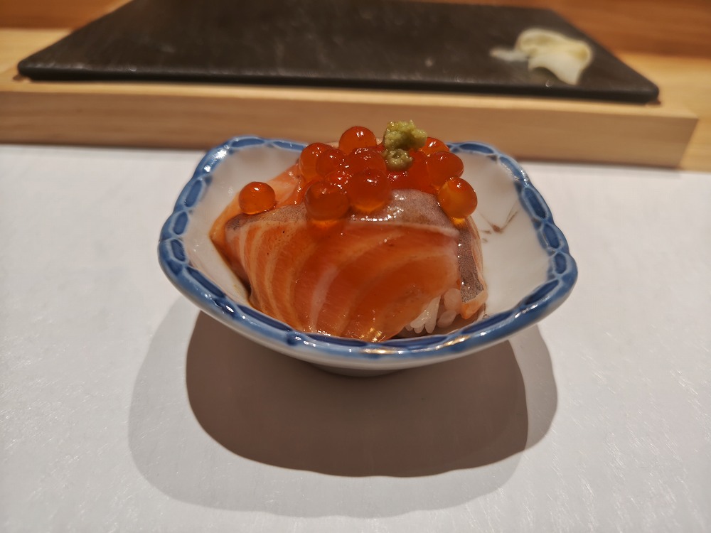 一口サイズの丼、サーモンとイクラなのである意味親子丼ですね!