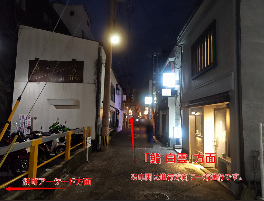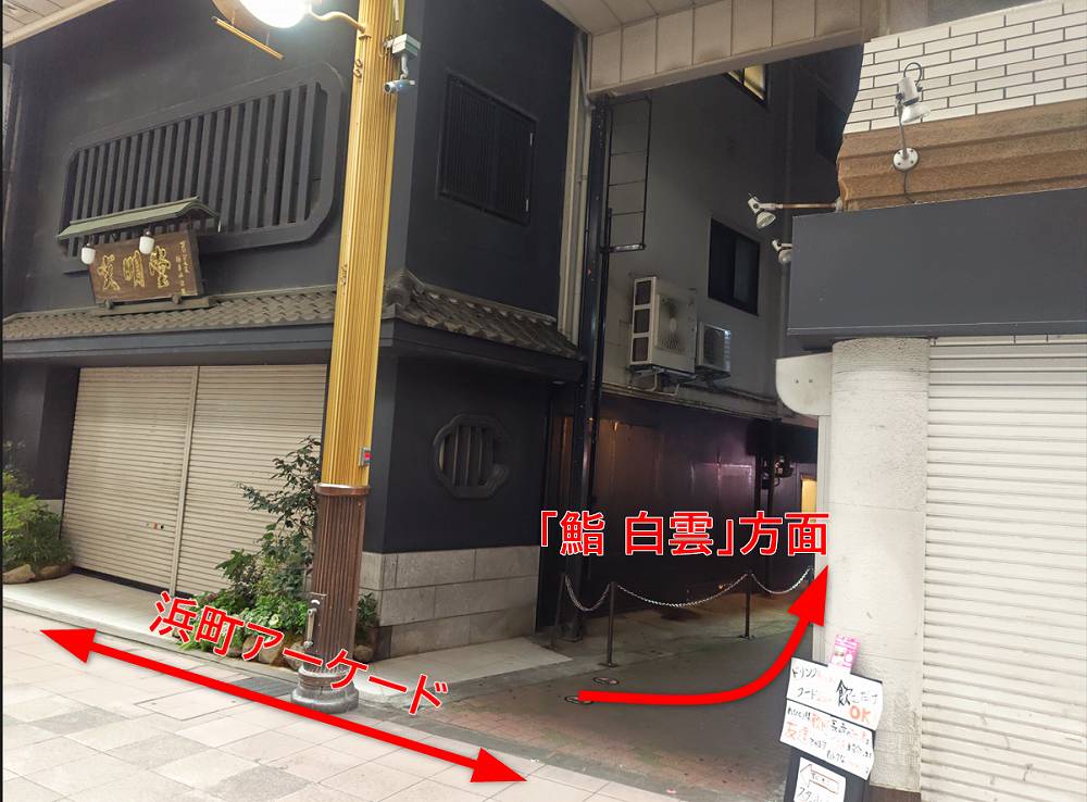浜町アーケードを50mくらい進むと右手に路地があります(文明堂総本店 浜町店さん横)。